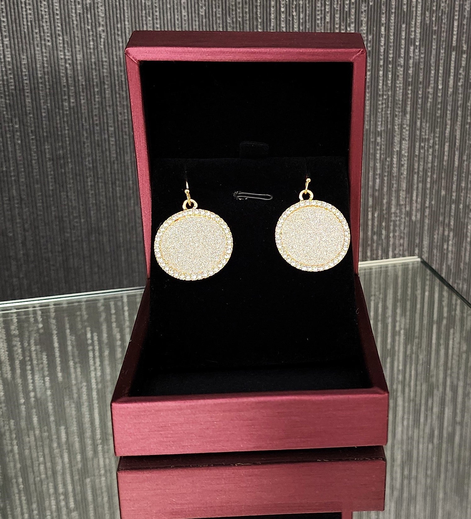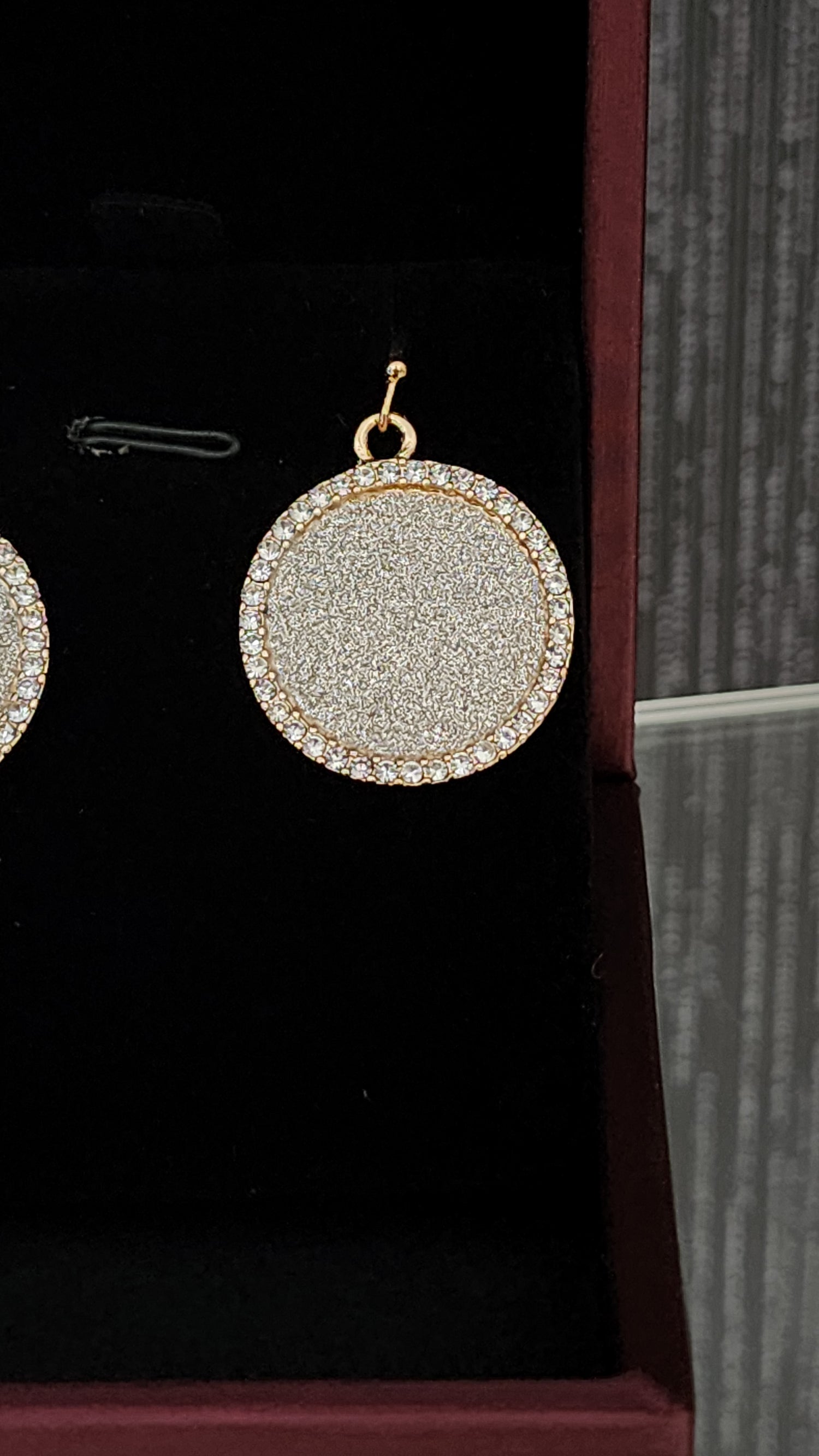 Each earring features a delicate gem circle adorned with shimmering glitter and gold plated trim, adding a touch of sparkle to your look. Available in gold finishes, these earrings offer versatility to complement any style or occasion. Whether you're dressing up for a glamorous evening affair or adding a touch of sophistication to your everyday ensemble, these earrings are sure to make a statement.