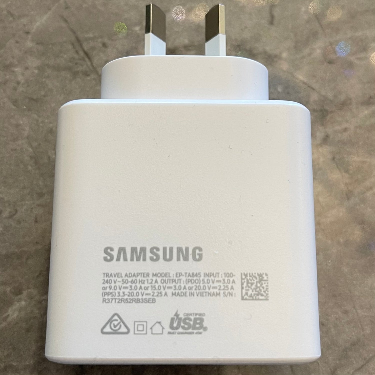 *Charging speeds may vary by device. Actual charging speed may also vary depending on usage, charging conditions, and other factors. 45W charging only available for Super Fast Charging 2.0 compatible device. *Use only Samsung-approved battery, charger, and cable specifically designed for your device. Incompatible battery, charger, and cable can cause serious injuries or damage to your device.*Do not use a cable whose covering is peeled off or damaged, and do not use any charger or battery that is damaged or malfunctioning.